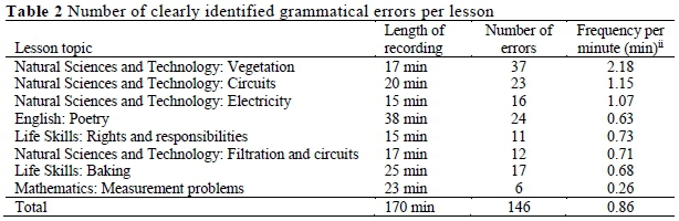 We focussed, not on the nature of these grammatical errors, but on the frequency of occurrence and the effect on comprehension. The number of clearly identified grammatical errors per lesson are presented in Table 2.