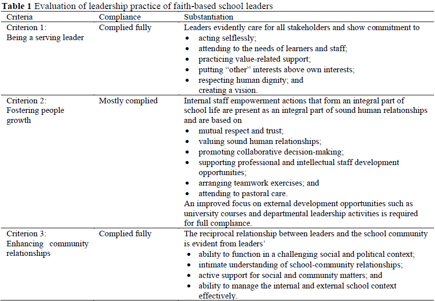 Table 1 below presents a summative review of the practices of leaders of faith-based schools. Compliance is appraised at three levels, namely complied fully, mostly complied, and no compliance. Substantiation for the evaluation of leadership behaviour per degree of compliance is included in the third column.
