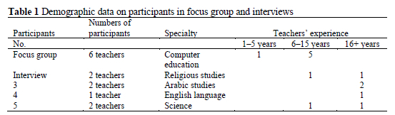 The focus-group session and interviews were recorded, then transcribed. Firstly, the focus-group transcript was verified, then the data were analysed. The interview data were then analysed separately. We used thematic analysis, in which themes emerged from the data during the process. We were open-minded about the themes that could emerge relating to the research.