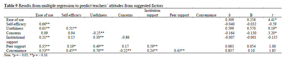To answer the third question - What factors influence teachers' attitudes toward using e-textbooks in education? - and to examine the possible predictors' (ease of use, self-efficacy, usefulness, concerns, institutional support, peer support, and convenience) influence on teachers' attitudes toward the use of e-textbooks, a multiple regression (Method = Enter) was run, and the results are presented in Table 9. The overall regression was statistically significant (R = .88, R2 = .77, adjusted R2 = .76, F [7,158] = 73.411). To assess the statistical significance of the contribution of individual predictors, the t ratios for the individual regression slopes were examined. Three of the seven predictors were significantly predictive of teachers' attitudes toward the use of e-textbooks: ease of use, t (158) = 4.413; usefulness, t (158) = 3.204; and concerns, t (-158) = 3.204.