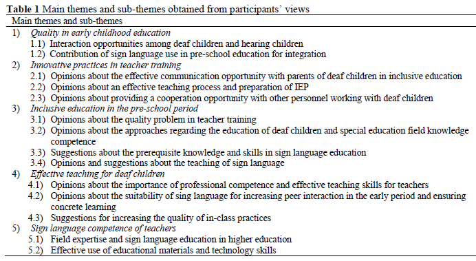 As a result of the analysis of the participants' views, five themes were obtained: "Quality in early childhood education", "Innovative practices in teacher training", "Inclusive education in the preschool period", "Effective teaching for deaf children" and "Sign language competence of teachers." The themes and sub-themes developed from the data analysis are presented in Table 1.