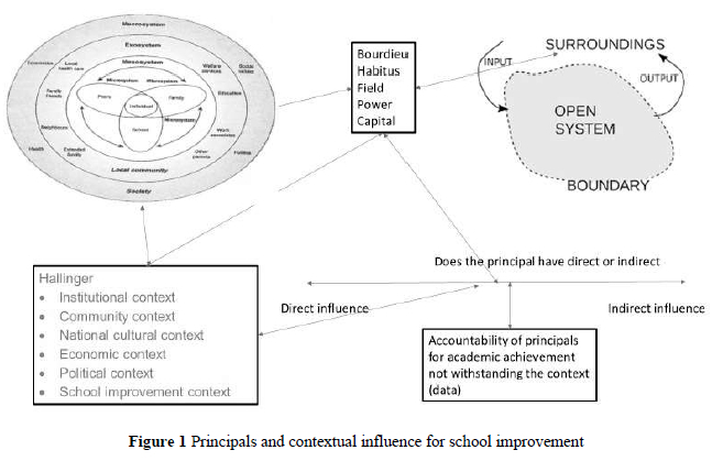 Lunenburg (2010) claims that systems may be open or closed, which implies that organisations are either strongly or less influenced by their environment. Hallinger's theory of contexts elaborates on five essential contexts, namely, institutional, community, national cultural, economic, political and school improvement. These can be incorporated in the different systems levels suggested by Bronfenbrenner (1977). Bourdieu's theory links with the above by indicating that the individual with habitus functions in a specific field (different systems levels according to Bronfenbrenner) links to the context areas that Hallinger mentions. The interaction between these systems and contexts has a certain influence on the potential effectiveness of leaders.