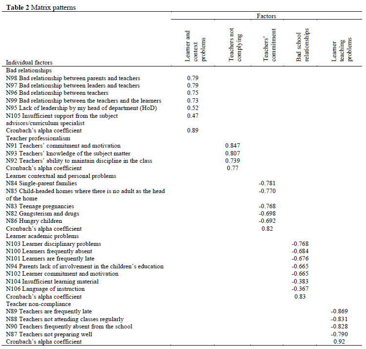 From the individual factors, a matrix pattern was created with Oblimin rotation. The factor analysis was conducted to group the individual factors to assist in the interpretation of the factors which may play a role in the quality of education. (Pietersen & Maree, 2016b). The validity and reliability of the statistical data were determined by a principal component exploratory factor analysis with Oblimin rotation (Lorenzo-Seva, 2000) on the 25 items measuring problems that may influence principals' ability to lead schools in socioeconomic-deprived contexts with the expectation of improving the quality of the education in these schools.