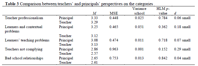 The principals' and teachers' perspectives on the importance of each category did not differ significantly. In fact, their perspectives on the order of importance of the categories were similar, as both groups scored teacher professionalism and learner and contextual problems as the most important contributors.