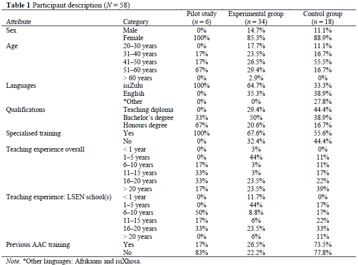 Non-probability purposeful sampling was used to select and recruit teachers from three LSEN schools in KwaZulu-Natal (KZN) (covering the districts of Umlazi [N = 1] and uGu [N = 2]). Strict ethical procedures were upheld, and permission was obtained from the Department of Education in KZN, and consent from the three relevant school principals and all the teachers. The inclusion criteria were that the participants were registered with the South African Council for Educators (SACE) as teachers, participants were employed at the participating LSEN schools, and the participants had to be able to read, write and speak in English. Teachers who did not meet these criteria were excluded. Fifty-eight teachers participated - six in the pilot study, 18 in the control group and 34 in the experimental group. The participants' demographics are presented in Table 1.