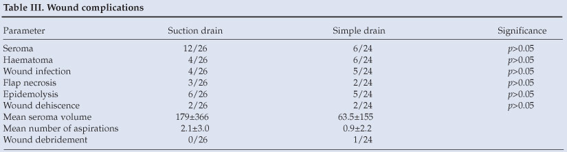 The only significant difference between the two groups was cost and ease of management. Suction drains cost almost 15 times more than simple drains. In terms of complications, one needs to consider the cost of treating haematomas and wound infections with seromas. Since there is no significant difference in the incidence of complications, a difference in the management of complications is not expected. We controlled intraoperative variables by reporting patients managed by only 1 surgeon. This made our study population small and might have 'underpowered' the study in the detection of small differences that occurred in some parameters, such as seroma and haematoma.