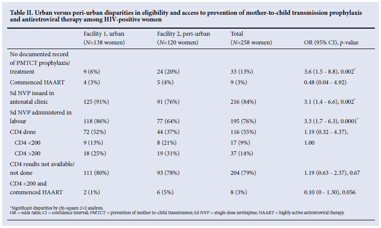 There was no documentation of PMTCT prophylaxis in 33 (13%) of the maternity records and 10 (18.9%) clinics. This was significantly (p=0.002) more evident among women who attended clinics in the peri-urban area (OR 3.6, 95% CI 1.5 -8.8) (Table II). The median frequency of antenatal NVP dispensing at 43 of the primary health clinics attended by HIV-positive pregnant women was 87% (interquartile range (IQR) 67 - 100). Among these, 15 facilities (33%) were reported with antenatal NVP dispensing frequencies of less than 80%, 9 of which were also identified with sub-optimal (<75%) access to HCT services. One hundred and ninety-five HIV-positive pregnant women (76%) had NVP administered during labour at the delivery hospital. The urban clinics were more likely (p=0.002) to dispense NVP during antenatal attendance (OR 3.1, 95% CI 1.4 - 6.6).