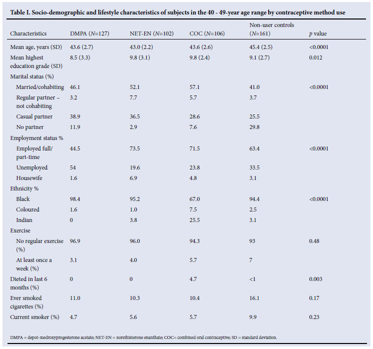 A total of 496 women were recruited. There were some differences between the characteristics of the 4 groups in the 40 -49-year age group (Table I). Most women presenting as non-users tended to be >45 years, resulting in this group being on average 2 years older than the 3 user groups (p<0.001). There were a similar proportion of African women in both the injectable and non-user groups, but there was a significant difference in the composition of the COC group, where 26% were Indian women. Across all groups, few women exercised, and none in the 2 injectable groups reported following a diet in the last 6 months. Less than a fifth of the women had ever smoked, and few were current smokers.