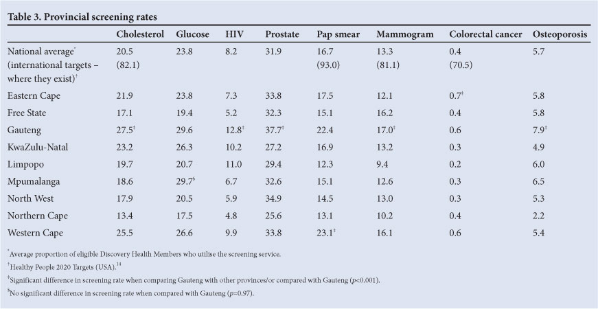 RESULTS: Nationwide screening rates were 20.5% for CDL, 8.2% for HIV and 31.9% for cancer. Despite similar insurance coverage, screening rates ranged from 0.3% to 0.95% lower in other provinces compared with Gauteng. Of all the provinces, Gauteng had the highest annual screening rates for CDL, breast cancer, prostate cancer and HIV (p<0.001), while the Western Cape had the highest rate for cervical cancer (p<0.001).
