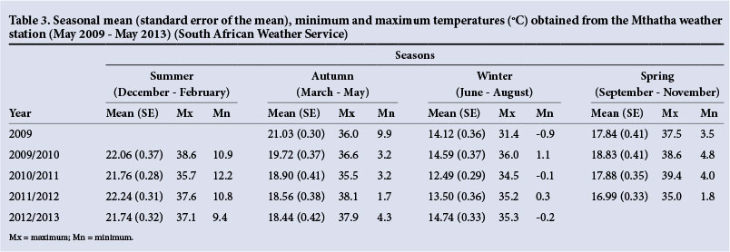 The cases were drawn from a wide area of the Eastern Cape (Fig. 2), which is the catchment area that falls under the management of the MHC located in Mthatha. There was little difference between summer and autumn temperatures in Mthatha during the study period (Table 3). The highest temperature recorded for summer was 38.6°C in 2009/2010 and for autumn 38.1°C in 2012. There were no extreme weather conditions in Mthatha (Table 3).