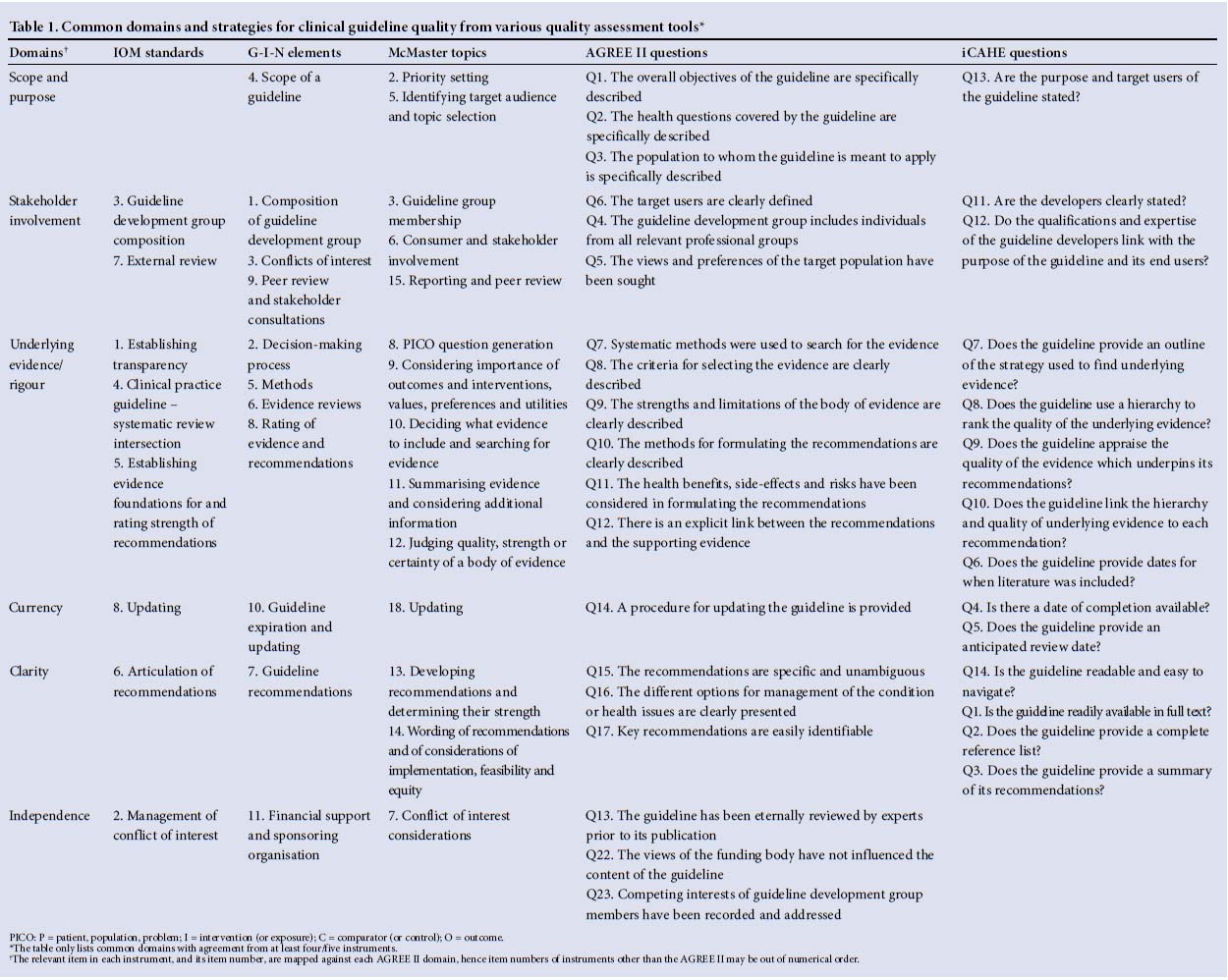 Between 2011 and 2013, three standards were independently proposed, to assist CPG developers in addressing key issues of quality (Institute of Medicine (IOM) 8 standards,[2] G-I-N 11 standards,[4] and McMaster University group 18 standards[9]). Concurrently, two checklists were independently developed to appraise CPG quality. The AGREE II checklist (Appraisal of Guideline ResEarch and Evaluation) uses six domains incorporating 23 items (each scored 1 - 7),[10] while the iCAHE checklist (International Centre for Allied Health Evidence) provides a simpler alternative for policy makers and clinicians, with seven domains incorporating 14 binary items.[11]Table 1 compares the items in each checklist, using the AGREE II domains to standardise comparison. Domains common to all instruments are 'stakeholder involvement', 'underlying evidence', 'currency' and 'clarity'.