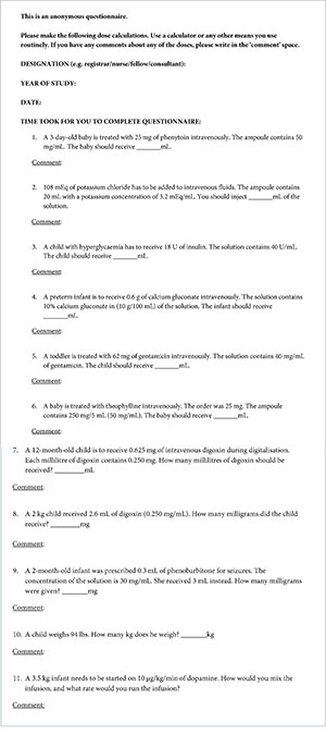 Appendix 1. Questionnaire used to test drug dose calculation skills