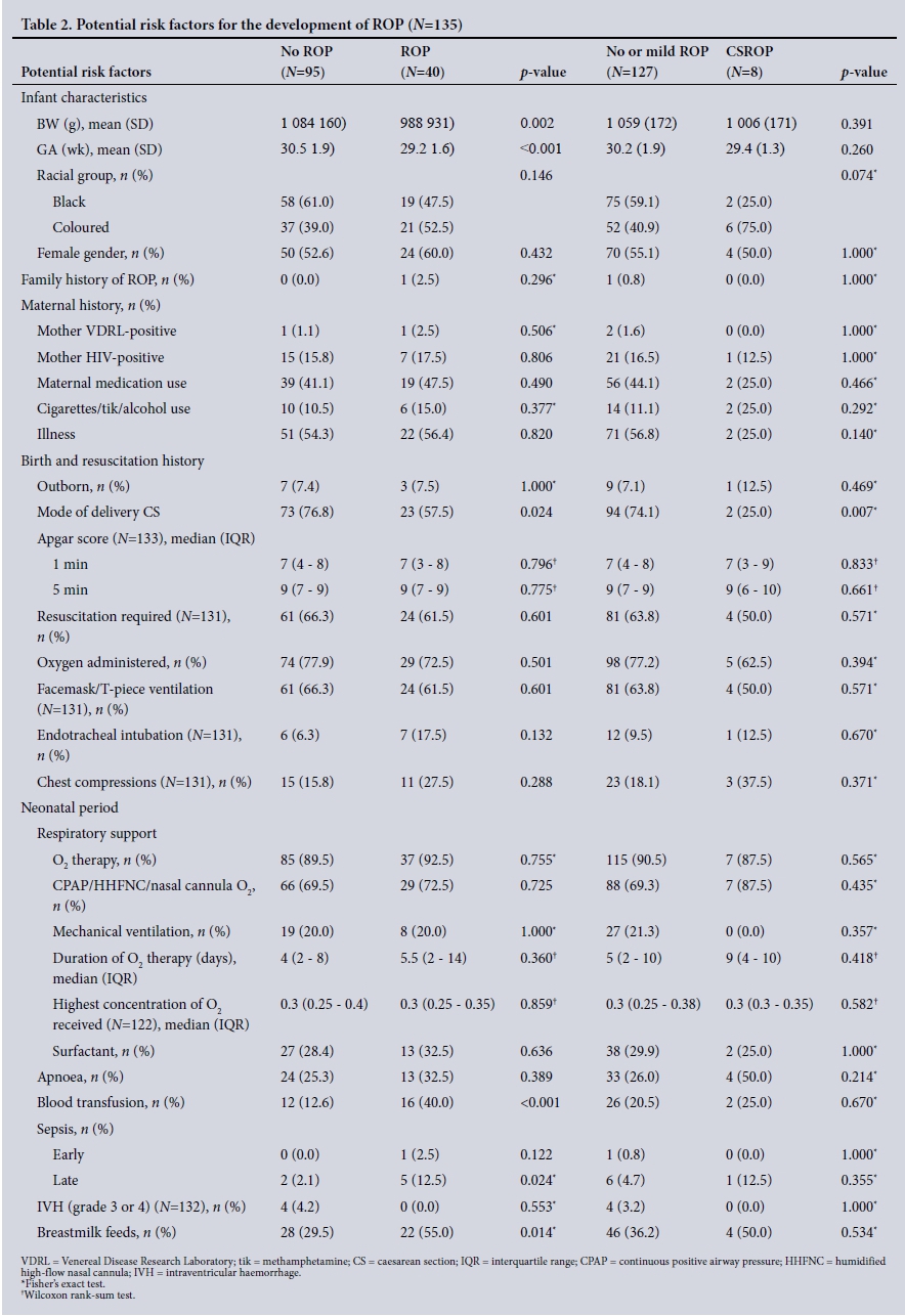 RESULTS. Three hundred and thirteen ROP examinations were performed in 135 of 191 eligible infants. The mean GA and BW were 30.1 weeks (standard deviation (SD) 1.9) and 1 056 g (SD 172), respectively. ROP was diagnosed in 40 infants (29.6%); 8 (5.9%) had severe ROP and 2 (1.5%) received laser treatment. Infants with ROP had a lower mean GA (29.2 weeks (SD 1.6) v. 30.5 weeks (SD 1.9)) (p<0.002) and a lower mean BW (988 g (SD 181) v.1 085 g (SD 160)) (p=0.001) than those without ROP. Infants weighing <1 000 g had a 2.5 times higher risk than those with a BW of >1 000 g of having ROP (95% confidence interval 1.05 - 5.90; p=0.03). Blood transfusions (p<0.002) and late-onset sepsis (p=0.024) were strongly associated with ROP. Screening was completed in 91.1% (123/135) of the infants.
