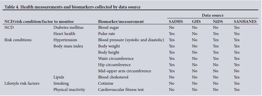 The most comprehensive surveys in terms of taking measurements necessary for monitoring NCD risk conditions and factors have been SANHANES, followed by SADHS (Table 4). SANHANES has been unique in using cotinine measurement and cardiovascular fitness tests, a 3-minute step test conducted by a doctor, but these were limited to individuals between the ages of 18 and 40 years, excluding much of the adult population. NiDS has not measured two vital biomarkers, blood sugar and cholesterol. GHS has not measured any biomarkers.