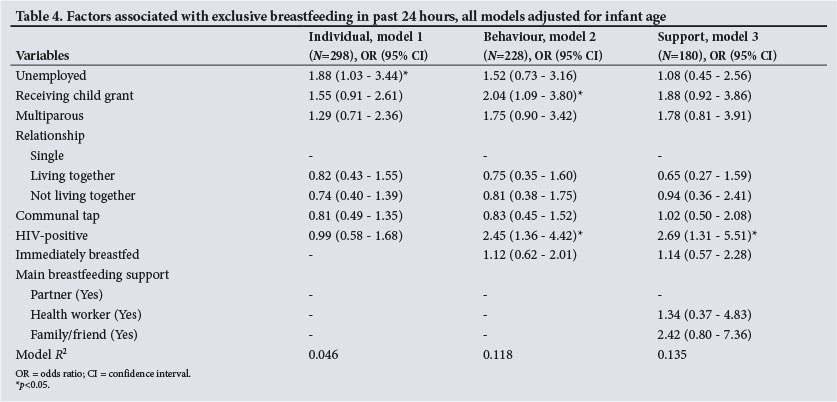 All logistic regression models were adjusted for infant age. Model 1 included individual sociodemographic variables, including HIV status (N=298). Unemployed mothers had nearly double the odds (1.88, 95% CI 1.03 - 3.44) of exclusively breastfeeding compared with those who were employed. No other individual-level factors were significant in model 1 (Table 4).