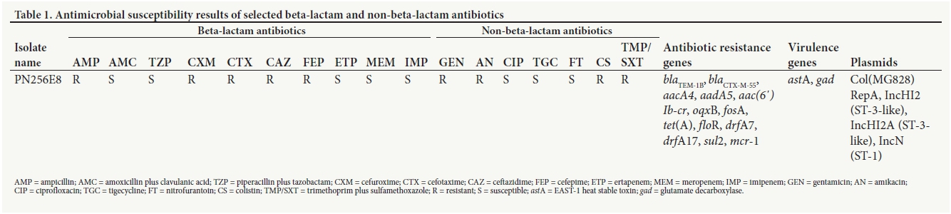 One of the ESBL-producing Escherichia coli isolated, PN256E8 (GenBank accession no. QJRZ00000000), showed resistance to several beta-lactam and non-beta-lactam antibiotics, including Colistin. This resistance phenotype was corroborated by the identification of theblatem-1b and blactx-m-55 genes through WGS, which also evidenced the Colistin (mcr-l)-resistant gene (Table 1). The isolate PN256E8 was ascribed to the sequence type (ST) 446 and phylogenetic group A. It further harboured two virulence factors and two replicons along with three plasmid incompatibility groups, IncHI2 (ST-3-like), IncHI2A (ST-3-like) and IncN (ST-1).
