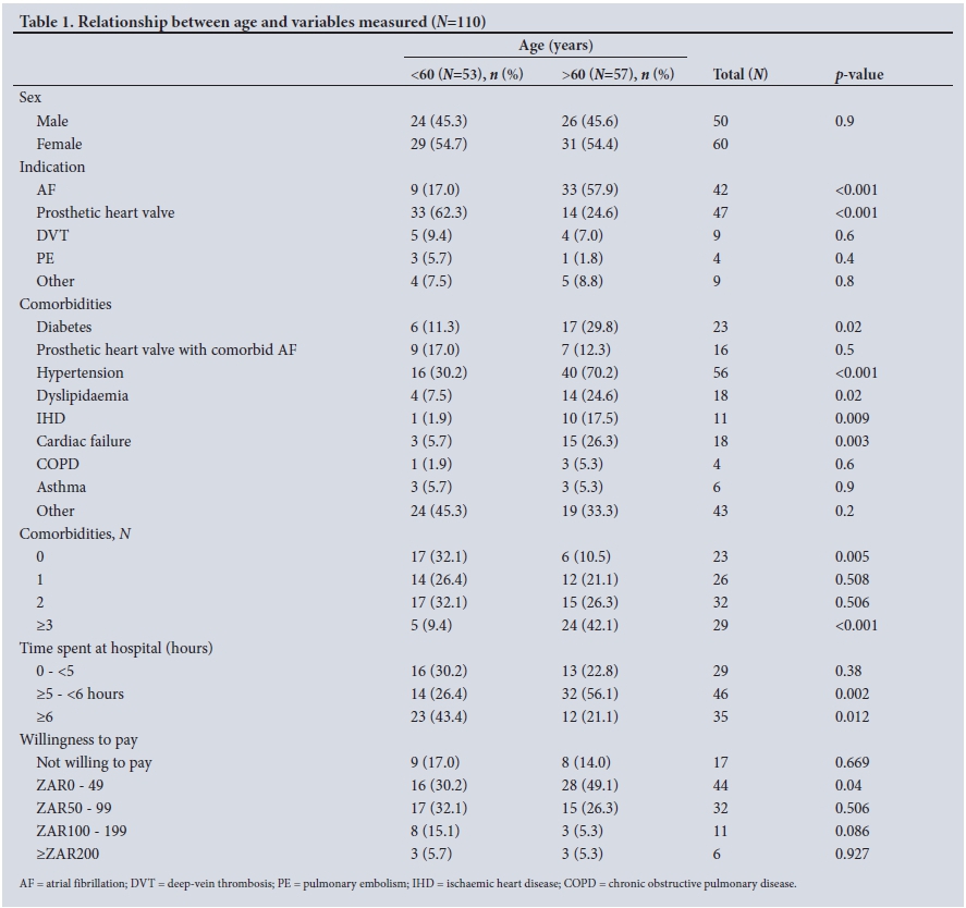 Our data collection showed that AF is a disease of the elderly and that prosthetic heart valves are more prevalent in individuals aged <60 years. The decision to divide the population into over and under 60 years was based on data from the Framingham Study, which suggested that the risk of stroke from AF increased significantly across the decades after 50 - 59 years of age.[10] We found a statistically significant prevalence of hypertension in participants aged > 60 years, which can be linked to the increased incidence of AF in the same age group. This result is comparable to other studies that emphasise the need for early cardiovascular risk factor control and prevention, as an increase in age and hypertensive heart disease are major risk factors for the development of AF.[11]The demographics and risk factor profile in our study are similar to an SA study by Sonuga et al.[12] They found hypertension to be the commonest comorbidity, and the patient population consisted of more females than males. A notable difference is that the commonest indication for warfarin was AF and not prosthetic heart valves as in our study. A reason for this may be that many patients had valve replacements at WWH, as cardiothoracic surgery used to be based there.[12]