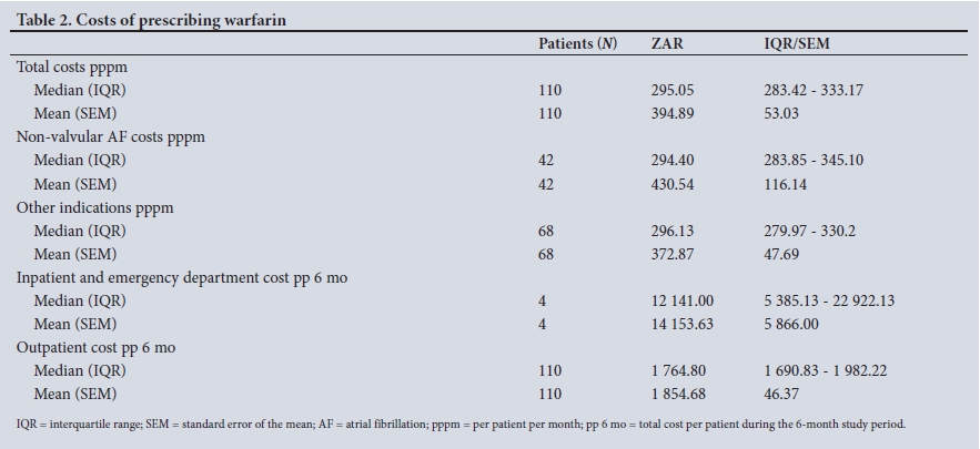 The total cost of all expenses related to warfarin per patient per month (pppm) over a 6-month period was calculated as ZAR394.98 and is tabulated with other costs in Table 2.