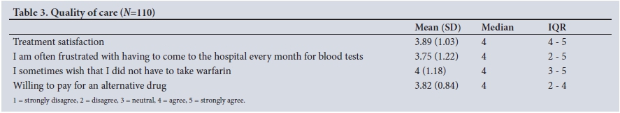 The quality of care analysis also revealed that 80.0% of participants agreed or strongly agreed that they were satisfied with the care they received, 69.1% agreed or strongly agreed that monthly INR monitoring frustrated them, and 74.5% agreed or strongly agreed that they wished they did not have to take warfarin.