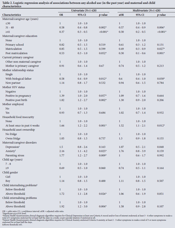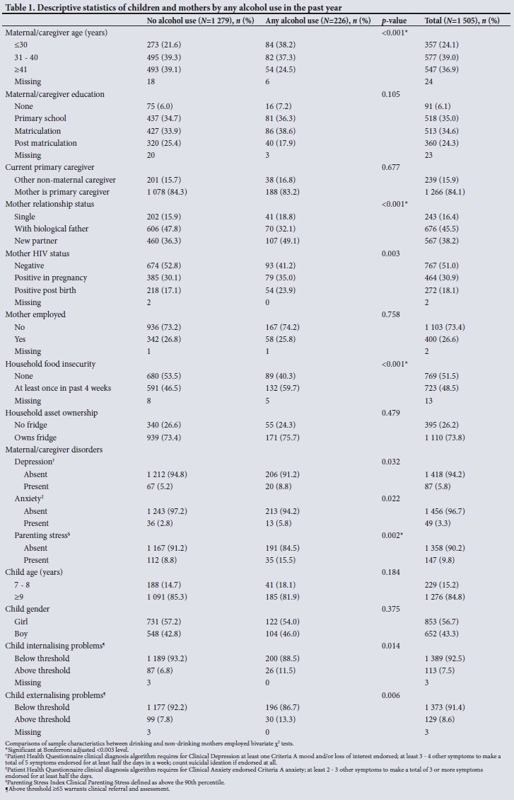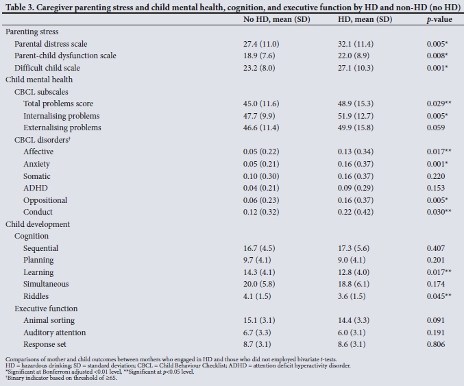 RESULTS: Of 1 505 women (1 266 mothers and 239 caregivers) with 1 536 children, 12% reported consuming alcohol and 3% reported HD. Higher maternal/caregiver age (31 - 40 years, adjusted odds ratio (aOR) 0.57 (95% confidence interval (CI) 0.4 - 0.9); >41 years, aOR 0.30 (95% CI 0.2 - 0.5)), education (matriculation, aOR 0.49 (95% CI 0.3 - 0.9); post matriculation, aOR 0.30 (95% CI 0.1 - 0.6)), and a stable relationship with the father (aOR 0.6 (95% CI 0.4 - 1.0)) were associated with no alcohol use. Food insecurity increased the odds of alcohol use (aOR 1.52 (95% CI 1.1 - 2.1)), while parental mental health (parenting stress, anxiety) and child mental health problems were associated with approximately double the odds of consuming alcohol in univariate analysis. Children of HD mothers/caregivers had higher mean scores for psychological problems (CBCL total score: no HD (mean 45.0) v. HD (mean 48.9); p=0.029) and lower cognitive scores (KABC Learning Scale: no HD (mean 14.3) v. HD (mean 12.8); p=0.017