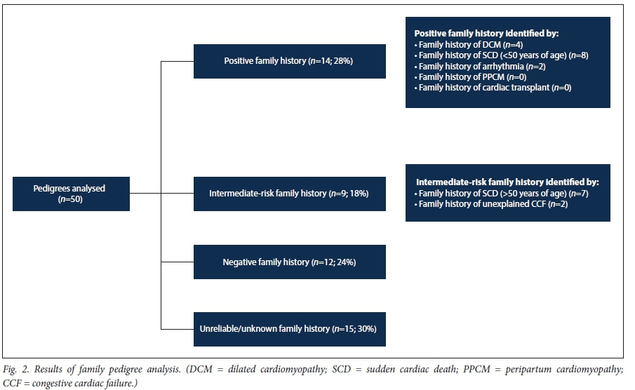 METHODS. This was a single-centre, cohort study performed at a quaternary care centre at CMJAH. Fifty unrelated probands diagnosed with IDCM and available first- and second-degree relatives were included in the study. A three-generation family pedigree was drawn up for all 50 probands. The pedigrees were analysed to identify the presence or absence of familial disease and categorised as positive, intermediate, negative or unreliable according to the family history obtained. From the 50 proband cases, there were 21 family members available for screening for features of IDCM. Eighty-two family members (55 first-degree and 27 second-degree relatives) were screened clinically. Screening included a personal history, full physical examination, electrocardiogram (ECG) and echocardiogram.