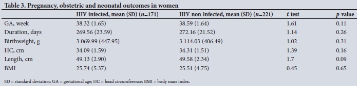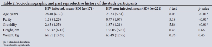 The study included 392 women. All HIV-infected women received ARVs - 166 (97%) were on a fixed-dose combination and 5 (3%) on second-line treatment or an unknown combination of ARVs. Ninety-three (54.4%) were virally supressed (<50 copies/mL), 18 (10.5%) had a HIV viral load >1 000 copies/mL and in 60 (35%) the HIV viral load was unknown. In 169 the mean CD4+ count was 459 cells/μL. There was a significant difference in age, parity and gravidity (p<0.01) between the two groups (Table 2). There was no difference in maternal height (p=0.66) or weight (p=0.45) and therefore not in body mass index (BMI) (Table 2).