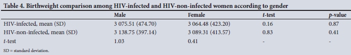 METHODS. This was a retrospective study, and data were obtained from the maternity records of women who delivered at Stanger Hospital, SA, from August to December 2016. Pregnancies were dated using an early ultrasound scan. Women with comorbidities that are known to affect birth anthropometry were excluded, as well as all self-reported smokers. Women were divided into HIV-infected and HIV-non-infected groups and compared.