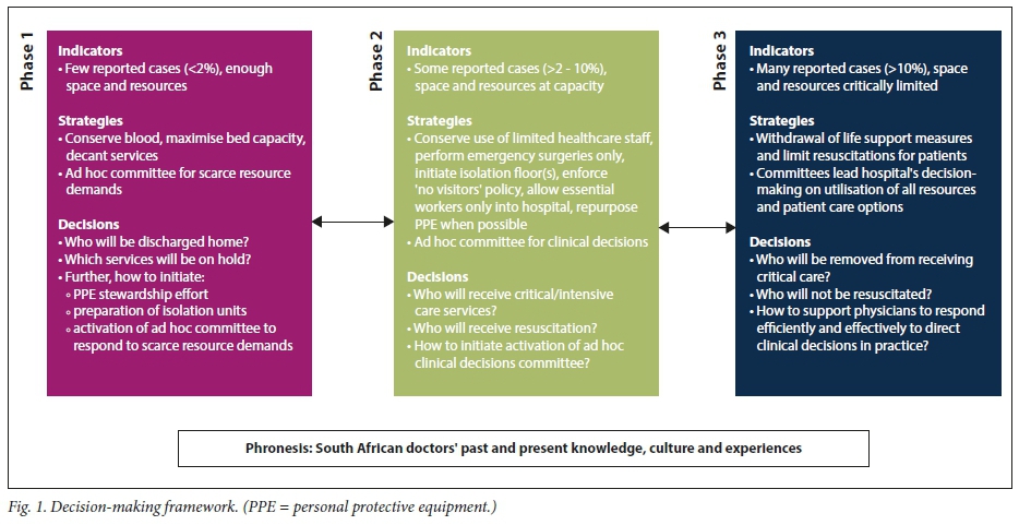 Doctors are among the heroes who are leading critical changes to practices and procedures during the novel coronavirus SARS-CoV-2 pandemic that had led to over 250 000 deaths worldwide as of 7 May 2020[1] However, there are many common constraints to adopting new behaviours and creating rapid changes in contemporary healthcare environments, such as healthcare workers' knowledge, attitudes and beliefs, heavy clinical workloads, resource constraints and poor communication.[2] These everyday barriers set the stage for compounding the challenges of a global pandemic in healthcare systems that were already stressed and strained. In South Africa (SA), a pragmatic decision-making framework with a local context is needed that builds capacity to: (i) address healthcare workers' needs; (ii) assist with allocation of scarce resources; and (iii) facilitate communication among key stakeholders in clinical practice. The authors of this article therefore wish to present an ethically justified framework on how to address a potential surge of clinical demands that can be used by doctors, in both the public and private healthcare sectors, to respond to difficult ethical decisions and choices.