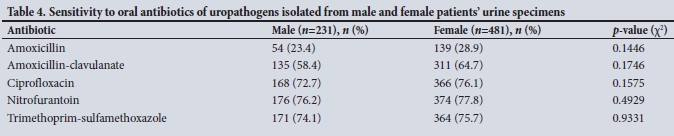 In comparison with a Gauteng-based study by Lewis et al.,[2]the prevalence of E. coli (n=410; 57.6%) in our study was lower than their reported 75 - 95% as the cause of CAUTIs, while Klebsiella spp. (n=97; 13.6%) were isolated at a higher rate than the 5 - 10% reported previously.[2] This finding was concerning, because Klebsiella spp. are often resistant to many of the available oral antibiotics (Table 3). Some of these organisms have the potential to produce extended-spectrum ß-lactamases (ESBLs), which enable them to inactivate ß-lactam antibiotics, rendering the drug ineffective.[11] The production of ESBLs is an important cause of treatment failure, and can have serious consequences for infection control.[13] An increase in the prevalence of these organisms in the community is concerning.