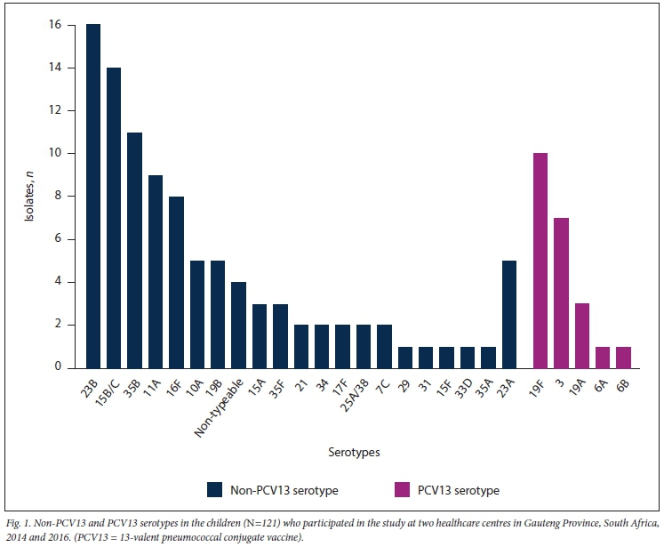 RESULTS: Pneumococci were isolated from 138/316 healthy children (43.7%) presenting for routine immunisation at two clinics. The median age was 8.3 months and the age range 1.4 months - 5 years. Carriage varied across the age groups: 6-14 weeks 35.5%, 9 months 27.5%, 18 months 21.7%, and 5 years 15.2%. Risk factors significantly associated with pneumococcal colonisation included young age (9 -18 months (odds ratio OR 3.5; 95% confidence interval (CI) 1.9 - 5.9), type of dwelling (single room (OR 8.1; 95% CI 1.3 - 52.3) or informal dwelling (OR 2.4; 95% CI 1.2 - 4.5)) and Haemophilus influenzae carriage (OR 5.6; 95% CI 0.6 - 2.5). Of the 26 serotypes detected, 19F (10/121; 8.3%) was the most frequent. The most frequent NVTs were 23B (16/121; 13.2%), 15B/C (14/121; 11.6%) and 35B (11/121; 8.2%). Children aged 9 months carried the highest proportion of NVTs (33/101; 32.7%). Penicillin non-susceptibility was observed in 20 NVT isolates (20/36; 55.6%) and 2 VT isolates (2/36; 5.6%).