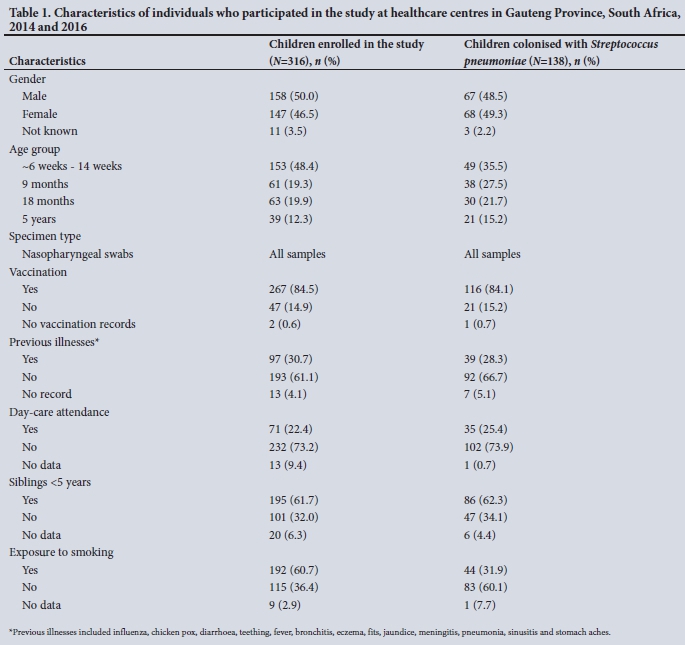 The study enrolled 322 children and infants in 2014 (n=96) and 2016 (n=220) from two healthcare centres in Gauteng. Six children had more than five variables of demographic information missing, and their data were excluded from further analysis. Characteristics of the individuals who participated in the study and those who were colonised with S. pneumoniae are set out in Table 1.