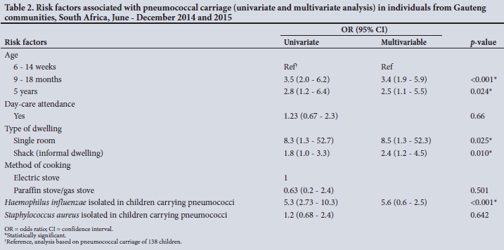 Risk factors not included in Table 2 showed no noticeable effect on pneumococcal colonisation. In the analysis, the following risk factors were statistically insignificant: attending a day-care centre, method of cooking, and co-colonisation with S. aureus. Children in the age group 9-18 months (OR 3.4; 95% CI 1.5 - 6.7) had an increased risk of pneumococcal colonisation compared with children aged 5 years (OR 2.8; 95% CI 1.2 - 6.4). Children living in single-room dwellings had an increased risk of pneumococcal colonisation (OR 8.5; 95% CI 1.3 - 52.3) compared with those living in houses, while those living in informal dwellings also had greater odds of colonisation (OR 2.4: 95% CI 1.1 - 5.2) compared with those living in houses, keeping other factors constant (Table 2). Children colonised with H. influenzae had a significantly higher risk of carrying pneumococcus (OR 5.6; 95% CI 0.6 - 2.5) compared with children who did not carry H. influenzae, also keeping other factors constant.