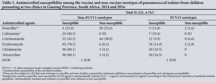 The swabs were placed in skim milk-tryptone-glucose-glycerin (STGG) and selectively cultured on 5% sheep blood agar (Diagnostic Media Products, NHLS, SA) containing 5 mg/mL gentamicin. The agar plates were incubated in 5% carbon dioxide overnight at 37°C to isolate Streptococcus pneumoniae, Staphylococcus aureus, Moraxella catarrhalis, Corynebacterium pseudodiptheriticum and Haemophilus influenzae. S. pneumoniae was identified using colony morphology alpha haemolysis on blood agar and susceptibility to optochin (5 μg; Becton Dickinson Microbiology Systems, USA). The isolates were tested for antimicrobial susceptibility to chloramphenicol, tetracycline, cotrimoxazole, erythromycin, clindamycin and rifampicin (Davies Diagnostics, UK) by disc diffusion (Kirby-Bauer disc method). Oxacillin discs (1 μg) (Davies Diagnostics) were used to screen for penicillin susceptibility. Oxacillin-resistant isolates were further tested using the E-test (Epsilometer test; BioMérieux, USA) (for penicillin and cefotaxime) to determine the minimum inhibitory concentration. The results were interpreted using the 2014 Clinical Laboratory Standards Institute guidelines.[12] Multidrug resistance was defined as non-susceptibility to three or more classes of antimicrobials. Oral penicillin breakpoints were used for the interpretation of penicillin results, i.e. susceptible <0.06 μg/ mL, intermediately resistant 0.12 - 1 μg/mL and resistant >2 μg/ mL. Intermediately resistant and resistant isolates were defined as non-susceptible. Of the 138 S. pneumoniae carriage isolates, 121 (87.7%) retained viability and were serotyped with the Quellung method using serotype-specific antisera (Statens Serum Institute, Denmark) at the Centre for Respiratory Diseases and Meningitis, National Institute for Communicable Diseases. The isolates were also serotyped by triplex real-time polymerase chain reaction assay containing 38 sets of serogroup/serotype-specific primer pairs.