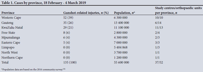 A total of 135 unique cases of gunshot-related fractures was captured across 8 of SA's 9 provinces. Table 1 outlines the distribution of cases across the country, representing all of the eligible patients seen at the participating institutions.