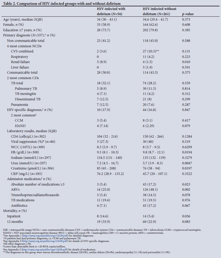 HIV-infected patients are compared in Table 2 according to the presence or absence of delirium. The two groups were similar in terms of age, gender and education status. With the exception of renal failure, there were no significant differences in CD or NCD primary diagnoses. Similarly, although patients with delirium had lower median CD4 cell counts (104 cells/uL (95% CI 32 - 214) v. 150 cells/μL (95% CI 62 - 266); p=0.1284) and lower rates of HIV viral suppression (27.3% v. 40%; p=0.519), these differences were not statistically significant. However, the delirium group had significantly lower haemoglobin (p=0.0194) and higher urea (p=0.0047) and creatinine levels (p=0.0197). A higher number of patients without delirium were using three or more admission medications (n=45; 17.2% v. n=3; 5.4%; p=0.023), with a greater number of patients on ARVs, antibiotics, and OI prophylaxis (trimethoprim/sulfamethoxazole and fluconazole). However, use of TB medication in the two groups was similar (19.6% v. 19.5%; p=0.976).