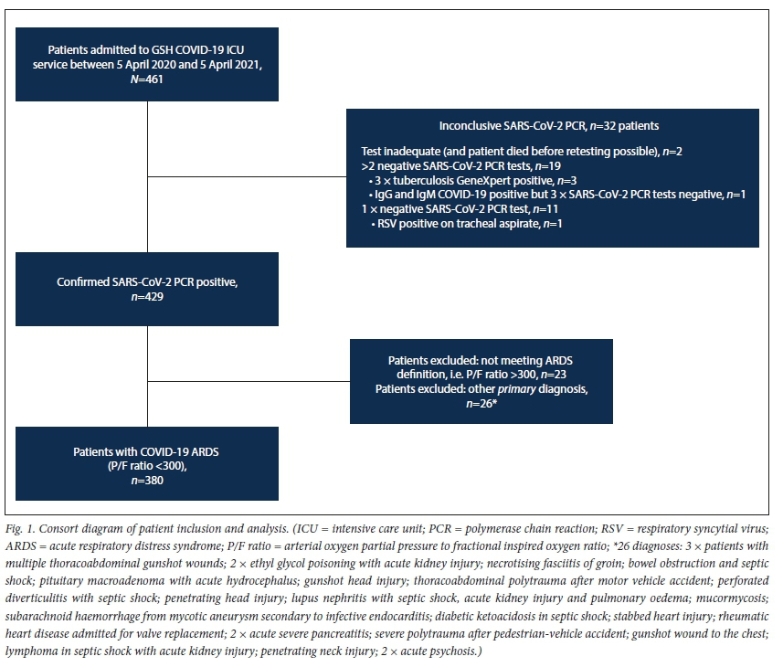 A total of 461 patients were admitted to the COVID-19 ICU service for IMV, of whom 32 did not meet the criteria for laboratory-confirmed SARS-CoV-2 infection, 23 did not meet the criteria for ARDS, and 26 were admitted with an alternative primary diagnosis and found to have coincidental SARS-CoV-2 infection. These patients were excluded from the study. Data from all 380 patients with confirmed COVID-19 ARDS were included in the final analysis (Fig. 1).