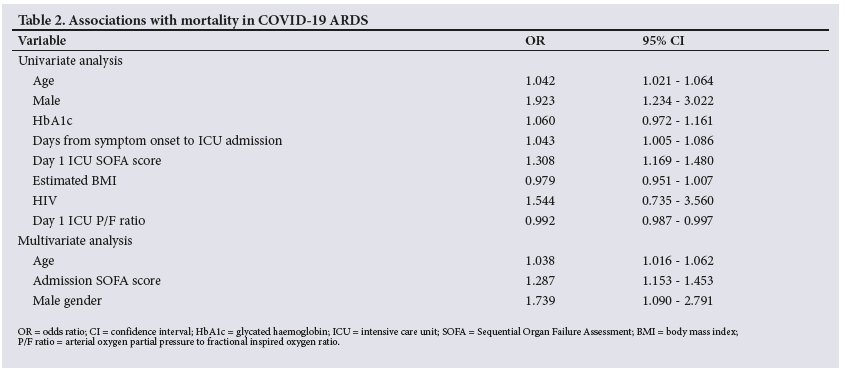 RESULTS. Over the 12-month study period, 461 patients were admitted to the designated COVID-19 ICU. Of these, 380 met the study criteria and 377 had confirmed hospital discharge outcomes. The median (range) age of patients was 51 (17 - 71) years, 50.5% were female, and the median (interquartile range (IQR)) body mass index was 32 (28 - 38) kg/m2. The median (IQR) arterial oxygen partial pressure to fractional inspired oxygen (P/F) ratio was 97 (71 - 128) after IMV was initiated. Comorbidities included diabetes (47.6%), hypertension (46.3%) and HIV infection (10.5%). Of the patients admitted, 30.8% survived to hospital discharge with a median (IQR) ICU length of stay of 19.5 (9 -36) days. Predictors of mortality after adjusting for confounders were male sex (odds ratio (OR) 1.74), increasing age (OR 1.04) and higher Sequential Organ Failure Assessment (SOFA) score (OR 1.29).