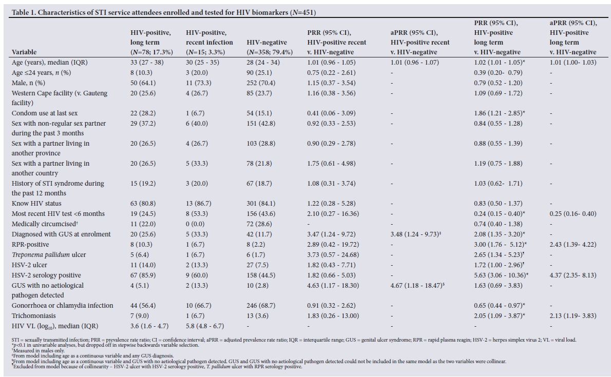 Of the 451 attendees tested by enzyme immunoassay in the HIV reference laboratory, 93 (20.6%) were HIV-positive on serology, while 358 (79.4%) were HIV-negative. Among the HIV-positives, 88/93 (94.6%) were Western blot-positive while 5/93 (5.4%) were Western blot-negative (Fig. 1). Of the 5 who were Western blot-negative and tested along with all the other HIV-negatives for presence of HIV RNA using nucleic acid amplification, all were NAAT-positive, indicating acute HIV infection. Of the 88 who were Western blot-positive, 22 were classified as having recent HIV infection on the LAg assay, although only 11 went on meet the criteria for recent infection based on VL levels >1 000 copies/ mL. In total, there were 15 positive individuals (16.1%) who met the criteria for recent HIV infection. Only 2/15 individuals who met the criteria for recent infection correctly reported being HIV-positive and none were on ART, either by ARV exposure or self-report. The median (IQR) VL among those who were recently infected was log10 5.8 (4.8 - 6.7). Table 1 describes HIV-positive and negative attendees, comparing HIV-positive, recently infected patients with those who were HIV-negative. Compared with being HIV-negative, being recently infected was independently associated with a genital ulcer presentation (adjusted prevalence rate ratio (aPRR) 3.48 (95% confidence interval (CI) 1.24 - 9.73); p=0.017) in a model adjusting for age and having genital ulcers at presentation. Being recently infected was also associated with no detectable STI-related ulcer pathogens (aPRR 4.67 (95% CI 1.18 - 18.42); p=0.024) in a model adjusting for age and ulcers with no detectable pathogens. There was a trend towards syphilitic ulcers, RPR positivity and having tested for HIV during the 6 months preceding enrolment being associated with being recently infected in univariable analyses, although the associations did not reach statistical significance. Of the 78 attendees who met the criteria for long-term HIV infection (83.9% of those who were HIV infected), 30 (38.5%) had plasma ARVs present and were considered to be on ART, while 48 (61.5%) were not. As expected, the proportion of individuals with suppressed VLs was higher among those who were on ART compared with those who were not (n=23/30 (76.7%) v. n=4/48 (8.3%); p<0.001). Although viral suppression was higher among those on ART, the level of viral suppression was below the then Joint United Nations Programme on HIV/AIDS (UNAIDS) target of 90%. Of those who had plasma ARVs detected (n=30), 21 (70.0%) self-reported being on ART, indicating under-reporting of HIV status and ART use. Comparing attendees who were HIV-positive with long-term HIV infection (n=78) with those who were HIV-negative (n=358), those who were HIV-positive were less likely to have tested for HIV during the preceding 6 months (aPRR 0.25 (95% CI 0.16 - 0.40); p<0.001), more likely to be RPR serology-positive (aPRR 2.43 (95% CI 1.39 - 4.22); p=0.002) and HSV-2 serology-positive (aPRR 4.37 (95% CI 2.35 - 8.13; p<0.001), and more likely to have T. vaginalis infection on genital discharge specimens (aPRR 2.13 (95% CI 1.19 - 3.83); p=0.011) in a model adjusting for these variables as well as age.