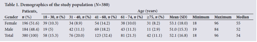 The patient sample consisted of more females (51.6%) than males (48.4%), with an overall mean age of 52.1 years (Table 1).