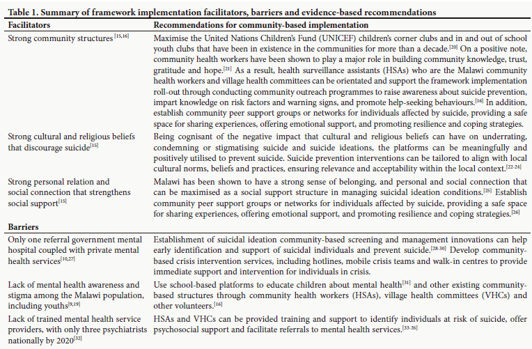 Therefore, in this communication, we advocate for the maximisation of existing community structures to raise awareness, screen, manage and refer those at risk of suicide and with suicidal ideations. In Table 1, we summarise the Malawi National Suicide Prevention Framework facilitators and barriers to implementation. In addition, we offer evidence-based recommendations for community-based implementation of the framework.
