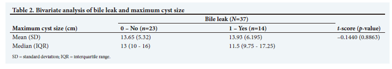 The median postoperative length of stay was 7 days, and there were no perioperative deaths, with 100% survival to discharge. On bivariate analysis, we observed no statistically significant difference in mean maximum cyst size between patients with and without a perioperative bile leak (Table 2).