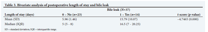 We observed a statistically significant difference in mean postoperative length of stay between patients who sustained a bile leak and those who did not. On average, patients with a bile leak had 9.83 days longer postoperative length of stay (Table 3).