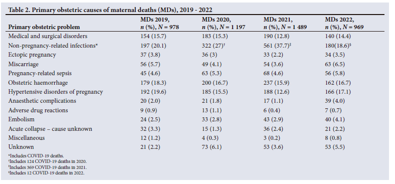 RESULTS. There were 35% and 8% increases in maternal and stillbirth mortality rates, respectively, in 2020 and 2021, which correlated with the COVID-19 waves. However, in 2022, rates returned to pre-COVID levels. Antenatal visits and facility births showed little change, but there was a shift to more rural provinces. The use of oral and injectable contraceptives and termination of pregnancy services decreased markedly in 2020 and 2021, with a sustained shift to long-acting reversible contraceptives. The increase in maternal deaths was predominantly due to COVID-19 respiratory complications, but also an increase in obstetric haemorrhage. Stillbirths increased significantly (10%) for birthweights between 2 000 g and 2 499 g, categorised mostly as unexplained stillbirths or preterm labour, but no increase in neonatal deaths was observed. Administrative avoidable factors increased by 24% in the 2020 - 2022 triennium, but there was no increase in patient/community level or healthcare provider-related avoidable factors during the pandemic years.