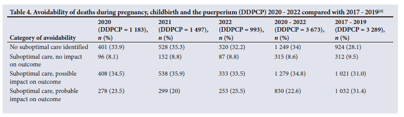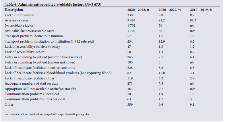 Saving Mothers reports provide information on the preventability of maternal deaths as assessed by independent maternal death assessors according to patient/community level, administrative and healthcare provider-related factors. These are shown in Tables 4, 5 and 6. Table 4 shows the overall avoidability of deaths for 2020 - 2021 (categories 3 and 4 combined). There were 58% potentially preventable deaths in 2020: 56% in 2021, 59% in 2022; and 57.4% in 2020 - 2022, compared with 62.4% in the previous triennium. The reduction of deaths assessed to be potentially avoidable was probably due to the high numbers of COVID pneumonia deaths, which were thought not to have been preventable. However, when further analysed by year and type of avoidable factor, there was an increase in administrative avoidable factors in 2020 and 2021, but not in patient/ community-related or health provider-related factors (Tables 5 and 6).