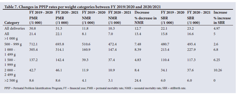 PPIP data allow for in-depth analysis of birthweight categories. The PPIP data from the corresponding financial years shows that the increase in the PNMR was mainly in the birthweight group 2 000 - 2 499 g in FY 2020 - 2021. There was an overall decrease in the neonatal death rate (12.7%) and an overall increase in the SBR of almost 5%. The changes in the mortality rates for each birthweight category are shown in Table 7.