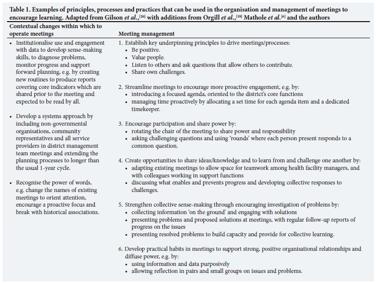The DHS is a critical organisational layer in the SA health system. But to fulfil its roles in supporting PHC and enabling intersectoral action for health, the DHS must enable and lead learning. Meetings are an important leverage point that can be adapted to encourage learning, without requiring additional resources. In this article, we have presented practical steps that can be used to transform meetings into learning spaces. These principles and practices are simple ideas about how to shift meetings away from being spaces of one-way information sharing (single-loop learning), to being spaces of two-way dialogue and engagement (double-loop learning) and more - to being spaces that themselves adapt over time to support the creativity and innovation needed to improve (triple-loop learning). These practices do not offer a one-size-fits-all approach and do not all need to be implemented in one meeting; different types of meetings will require different sets of actions. Yet it is always important to ensure congruency between what you do before the meeting, during the meeting and after the meeting, as actions in one stage can support or undermine efforts in other stages. Finally, change takes time - so intentionality, consistency and patience are key.