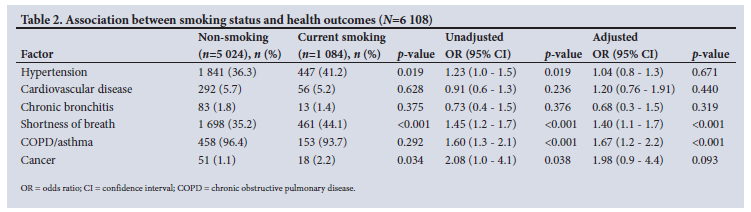 After adjusting for demographic factors, smoking, compared with non-smoking, was significantly associated with 40% increased odds of shortness of breath (adjusted odds ratio (aOR) 1.40; 95% CI 1.1 -1.7; p<0.001) and 67% higher odds of COPD/asthma (aOR 1.67; 95% CI 1.2 - 2.2; p<0.001).