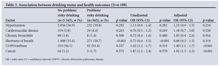The proportion of shortness of breath was higher among people who reported problem or risky drinking behaviour compared with those who did not (50.7% v. 35.4%, respectively; p<0.001). The proportions of individuals with other health outcomes were fairly similar between people who reported problem/risky drinking behaviour and those who did not (Table 3).