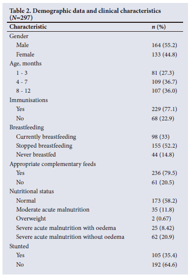 RESULTS. A total of 297 infants met the inclusion criteria over the 2-year period. The prevalence of acute diarrhoea was 24.8%. A total of 67% of the infants were not breastfeeding. Of the 67%, 52.2% had stopped breastfeeding before the age of 6 months, while 14.8 % were never breastfed. The average length of stay was 9.7 days. Severe malnutrition was noted in 29.3% of the infants. Of these, 8.42% had severe malnutrition with oedema, while 20.9% had severe malnutrition without oedema. Appropriate complementary feeds were provided to 79.5% of participants, and 61 (20.5%) were not provided with appropriate complementary feeds. Of these 61 infants, 48 were undernourished. Although most infants were discharged home, 4% (n=12) died. Five of the 12 infants (41.7%) who died did not receive the rotavirus vaccine.