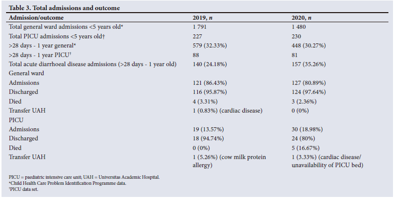 The total admissions during the study period were obtained from the Child Health Care Problem Identification Programme. In 2019, total admissions (<5 years old) were 1 791. Of these, 579 were children aged <1 year in the general ward, and 88 were in the PICU. A total of 140 infants <1 year were admitted for acute diarrhoeal disease, with 121 admissions in the general wards and 19 in PICU. During the period, 116 children were discharged alive from the general wards and 18 were discharged alive from PICU, 3 children died in the general wards, and none died in PICU. One child from PICU was transferred to another hospital, due to cardiac disease. The outcomes are unknown (Table 2).
